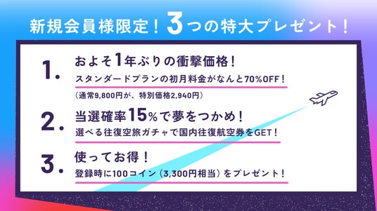 新規会員登録するだけで、15%の確率で国内往復航空券が当たるガチャにチャレンジ可能です。行き先は沖縄・北海道・九州など、当選後に選択できる仕組みで、全国26空港からの出発にも対応しています。さらに招待されたお友達は、新規登録70%OFFに加え、100コイン&「選べる往復空旅ガチャ」で使えるガチャチケットを1枚プレゼントします。