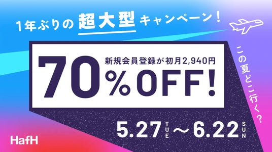 株式会社KabuK Style(本社:東京都中央区、代表取締役:砂田憲治、以下「KabuK Style」)が提供する旅行のサブスクリプションサービス「HafH(ハフ)」は、2025年5月27日(火)より、1年ぶりとなる超大型キャンペーンを開始します。本キャンペーンでは、新規会員登録者を対象に、スタンダードプランの初月料金が通常9,800円のところ70%OFFの2,940円になるほか、国内往復航空券が当たる「選べる往復空旅ガチャ」への挑戦チャンスも付与されます。また、既存会員を対象とした「友だち招待キャンペーン」も同時開催。紹介した方もされた方もお得に旅を楽しめる内容となっています。(https://www.hafh.com/topics/23378?abExternalOpen=true)