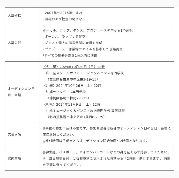 このたび開催されるオーディションは、2024年10月20日(日)名古屋、10月26日(土)沖縄、11月9日(土)札幌で行われます。2007年から2015年生まれであれば、国籍・性別に関係なく誰でも応募が可能で、ボーカル、ラップ、ダンス、プロデューシングを対象にしています。