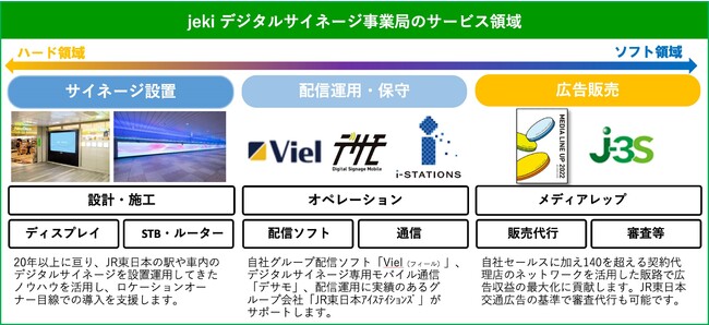 今後のデジタルサイネージの市場拡大を見据え、7月1日の組織改正で「デジタルサイネージ事業局」を新設し、本格的にデジタルサイネージに特化したメディアレップ事業を展開します。JR東日本グループの広告会社として駅や電車内などのデジタルサイネージを手掛けてきたjekiならではの知見を活かした、ロケーションオーナーやデジタルサイネージ関連事業者向けのサービスです。