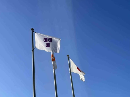 ■市役所ハミング広場にて市旗と同じデザインの旗(紫色)の掲揚