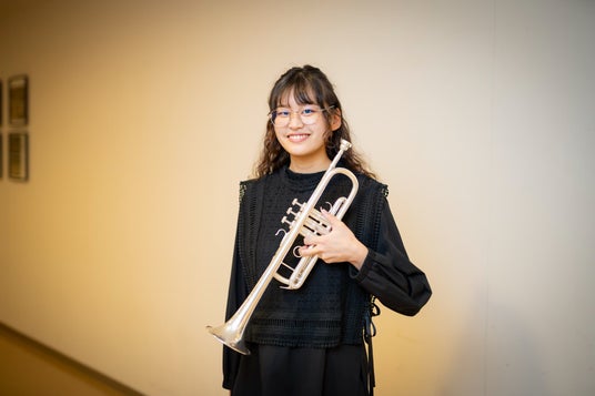 ラストの「木星」では、第一トランペットを担当し、華やかな音を会場いっぱいに響かせたいと思って特にソロパートに注力しました。一流ホールで、この名曲を演奏できて嬉しかったです。東京公演の会場であるオーチャードホールに立つのは初めてだったので、想像以上に天井が高く、舞台上と客席に届く音のタイムラグの調整方法など、演奏して初めてわかることがたくさんありました。大阪公演のフェスティバルホールではこれまで何度も演奏してきたので、「ホームに帰ってきた」と思えるほどでした。大阪芸術大学では学内外での演奏機会も多く、思い描いた以上の体験ができました。上達度や将来について悩んだ時期もあったのですが、努力を続けていればちゃんと成果につながります。「こんな優しい音が出せるようになりたい」と憧れて入学した橋爪伴之先生(演奏学科教授)の音色に少しでも近づけるよう、これからもトランペット奏者として成長し続けていきたいです。