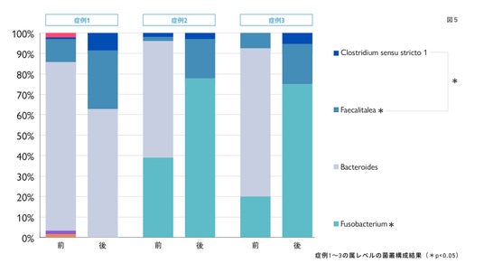 一般家庭で生活している皮膚症状のある犬3頭を対象に、犬のスキンケア用手作り食の給与試験を4週間実施しました。手作り食の主な原材料は、鹿肉、豚肉、サツマイモ、カボチャ、ニンジン、舞茸、ビーツ、ケール、真鯛オイル、ウコン粉末、寒天、ごま、フィッシュオイル、昆布、殺菌乳酸菌/ビタミン類、ミネラル類です。結果、3例中2例で、痒みまたは皮膚症状の改善が認められ(図1~4)、さらに腸内細菌叢において有用菌である3種の酪酸産生菌が増加し、非有用菌で炎症を促進するBacteroidaceae属が減少しました(図5)。α多様性は、症例1および3について高まりました。以上より、症例数は少ないものの、食物アレルギーを含めた皮膚症状のある犬において、原料の関係で状態を改善させる可能性が示唆されました。