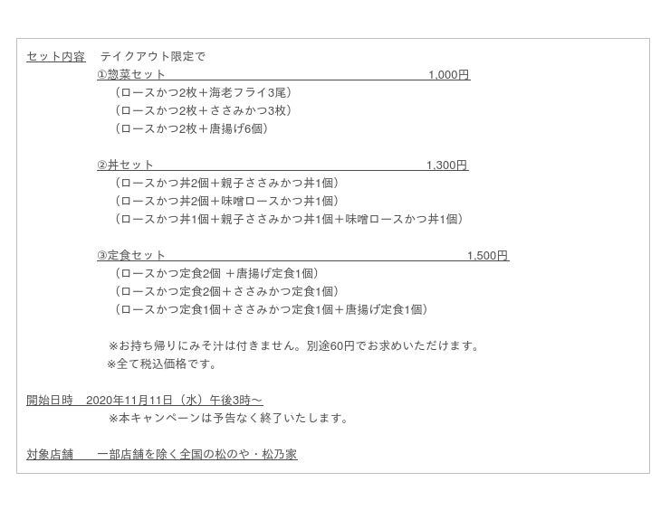 みんなの食卓応援団の松のやより テイクアウト限定 まとめ買いファミリーシリーズ第7弾。11月11日(水)から販売開始
