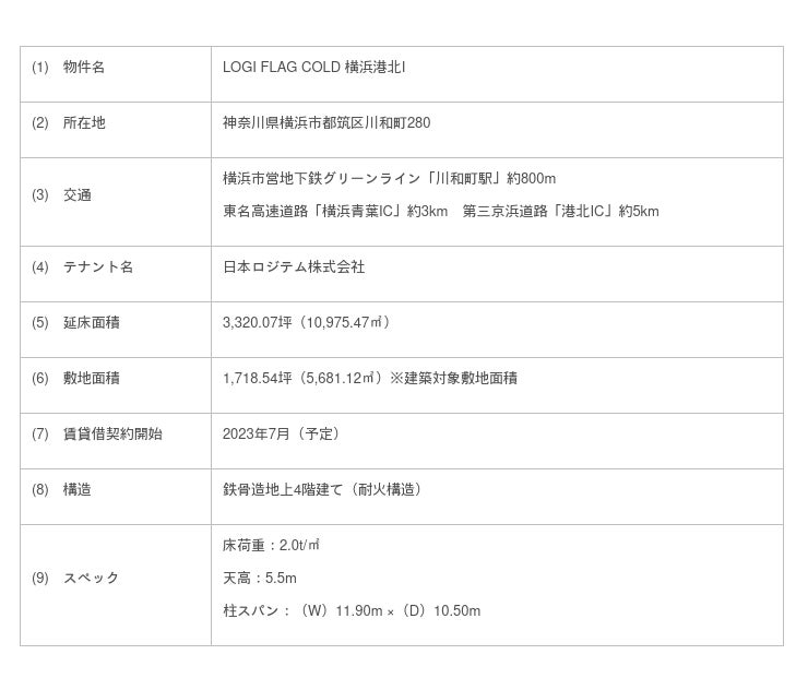 霞ヶ関キャピタル株式会社(本社:東京都千代田区、代表取締役:河本幸士郎、以下「当社」)は、 当社が開発用地のソーシングおよび企画立案をおこない、プロジェクトマネジメント業務を受託している神奈川県横浜市の物流施設開発プロジェクト『LOGI FLAG COLD横浜港北I』において、総合物流企業である日本ロジテム株式会社(本社:東京都港区、代表取締役社長:中西弘毅)がテナントとして決定いたしましたのでお知らせいたします。