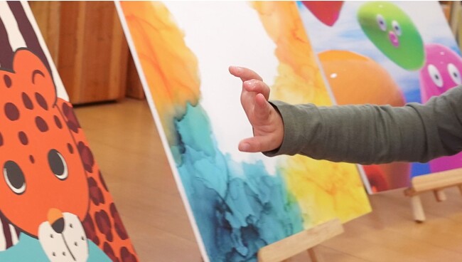 学生の皆様の「想い」が伝わる力作ぞろいで、検証施設(ピジョンランド上石神井)の子どもたちもワクワクしたのではないかと思います。今回、いくつかのデザイン(作品)が提示された中で、子どもたちの興味が集中したこちらの作品は、「はっきりとした色・輪郭」、「飛び出してくるかのような躍動感」、そして「目」と「何ものでもない形」が特徴的です。これらの特徴が、子どもたちが「はて?」「これなに?」「たしかめてみよう」と手を差し出し・歩みをすすめる要素になったのではないかな、と思っています。