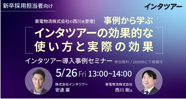 「働く」に関する社会課題をビジネスで解決するキャムコムグループの、株式会社インタツアー(代表:作馬 誠大、本社:東京都港区浜松町)は、2023年5月26日(金)に、新卒採用担当者向けインタツアー導入事例セミナー『東電物流株式会社の西川氏登壇! 事例から学ぶインタツアーの効果的な使い方と実際の効果』をオンラインで開催いたします。