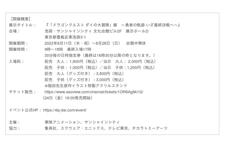 また、会場先行の「ダイの大冒険」グッズも盛りだくさんで、稲田先生による原作画を使用した特製グッズ付き前売り券も数量限定(3,000個)で販売します。