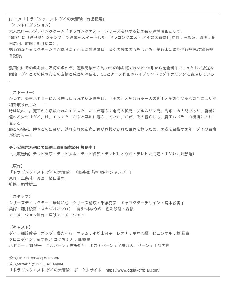 本展示イベントでは、原作・稲田浩司先生と三条陸先生の原作漫画の貴重な原画や資料の数々を堪能できる「原作原画展示」と、ダイたちの冒険の軌跡を振り返るアニメ資料展示や、感動のアニメ映像に没入できる「アニメ展示」が両方同時に楽しめる内容になっています。