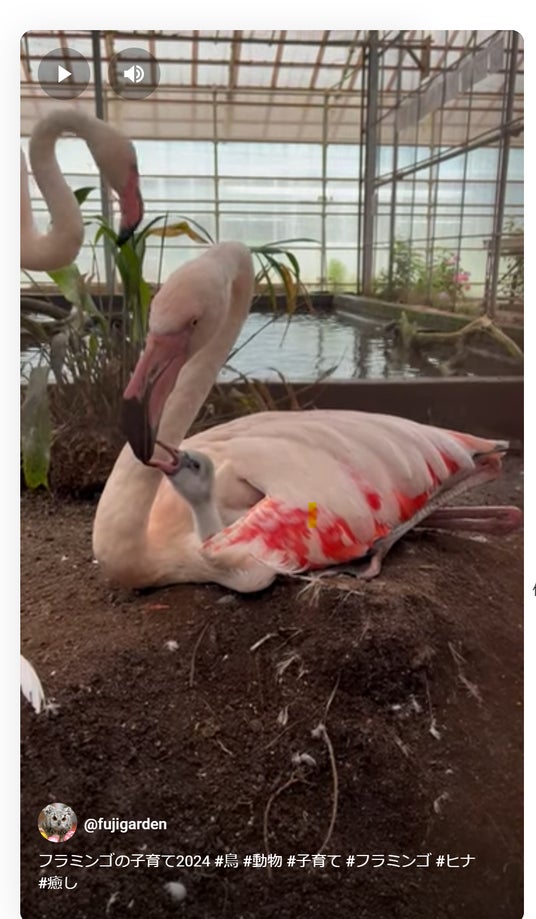 ファミリーに見守られながら(時々ちょっかいだされて喧嘩しながら)お母さんフラミンゴは今日も子育てに奮闘中です。毎年6~7月に楽しめるほのぼのした富士花鳥園の風景のご紹介です。