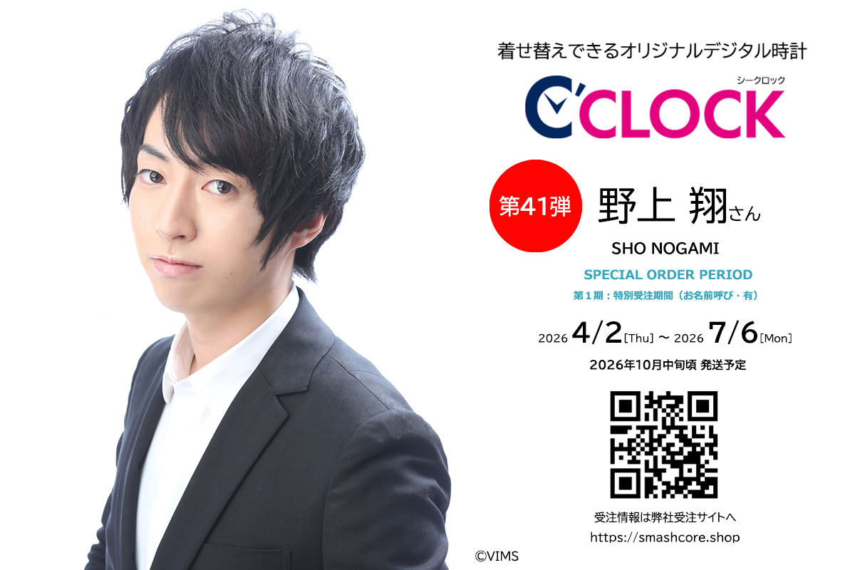 株式会社スマッシュコア エンターテインメント(本社:東京都中央区、代表取締役:福池 功)は、自社が展開する声優デジタル時計【C’CLOCK(シークロック)】シリーズ第41弾となる 野上翔さんモデル の受注を2026年4月2日(木)の正午より開始いたします。受注期間は複数期に分かれて実施されます。詳細なスケジュールや製品仕様については特設サイトをご確認ください。