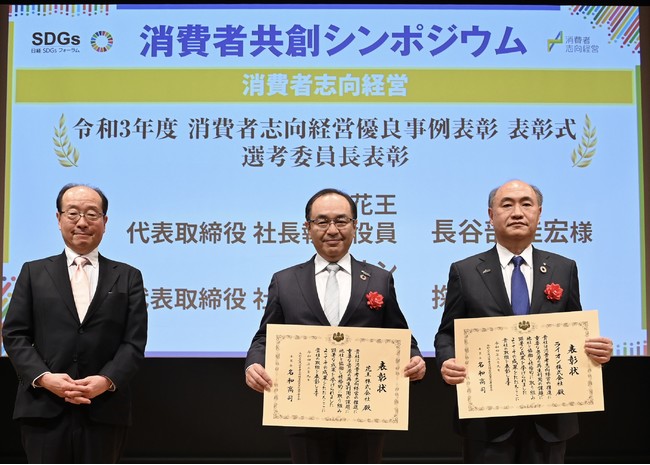 花王株式会社(社長・長谷部佳宏)とライオン株式会社(社長・掬川正純)は、消費者庁が主催する「令和3年度消費者志向経営優良事例表彰」において、新設された『選考委員長表彰』を受賞しました。消費者志向優良事例表彰は、消費者志向経営の推進を図ることを目的として、消費者志向経営に取り組むことを自ら宣言し、宣言に基づいて事業者が行なっている優れた取り組みを表彰するものです。2022年3月9日に日経ホール(東京都千代田区)にて表彰式が執り行なわれました。