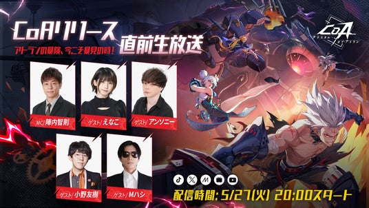 CoA正式リリースを記念して実施する「CoAリリース直前生放送~アトランの暴険、今こそ暴見の時!~」はMCに陣内智則、さらに、本作品内で「雲心」役を務めるコスプレイヤーのえなこ、「剣士」役の声優小野友樹など、豪華ゲスト陣を迎え、CoAの魅力や楽しみ方をご紹介します。また、生放送中には視聴者がリアルタイムで参加できる各種キャンペーンも実施します。豪華プレゼントをゲットするチャンス!ぜひご参加ください!