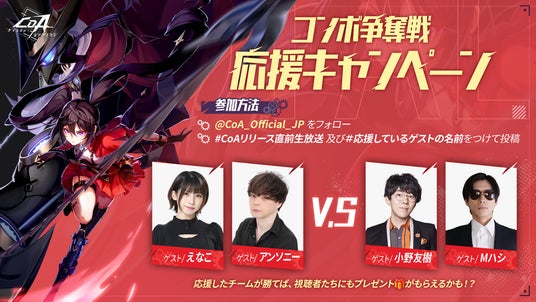 - 参加方法:1. @CoA_Official_JPをフォロー2.#CoAリリース直前生放送 をつけて番組の感想を投稿合計最大30万円相当の賞品を抽選するチャンス!