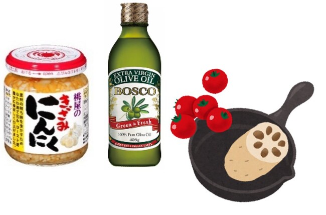 2. スキレットや小鍋にれんこん、桃屋のきざみにんにく、BOSCOエキストラバージンオリーブオイルを