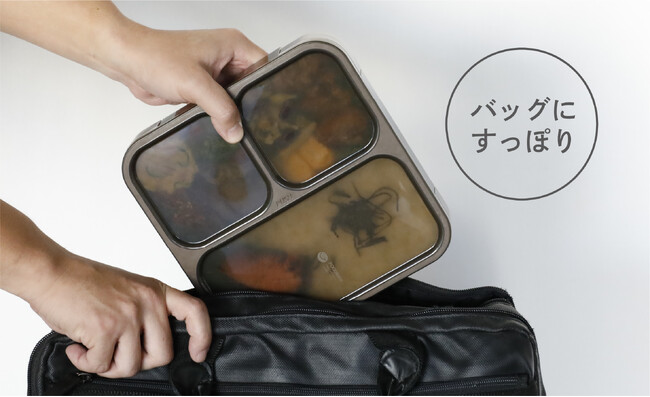 フードマンは荷物が入ったバッグにもすっきり入れられる「立てて運べる薄型弁当箱」。