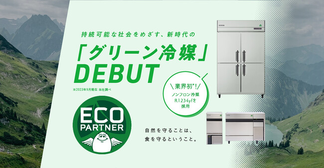 その中の取り組みの一つ「グリーン冷媒への転換」として、地球温暖化係数(GWP)の極めて低いノンフロン冷媒R1234yf (GWP:1)を採用した業務用冷凍冷蔵庫、製氷機を開発致しました。