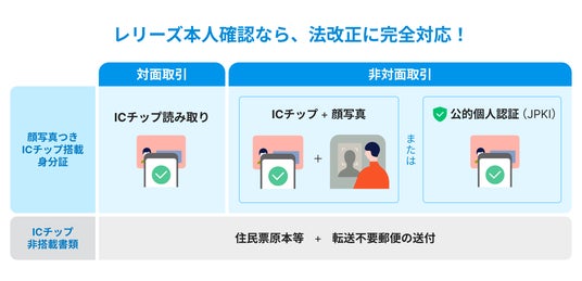 - 【対面取引】 改正後の原則的な確認方法であるICチップ読み取り機能に対応します。マイナンバーカード等のICチップ搭載本人確認書類の提示を受けた際に、読み取り装置を通じてチップ内の情報を取得する機能を実装します。ICチップ非搭載書類による確認を行う場合は、住民票原本等の書類の提示を受けたうえで、事業者がレリーズに当該情報を入力し、レリーズから転送不要郵便の送付および到達確認までを一貫して行うことが可能です。