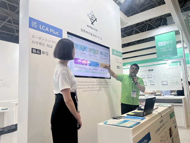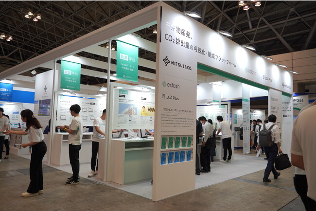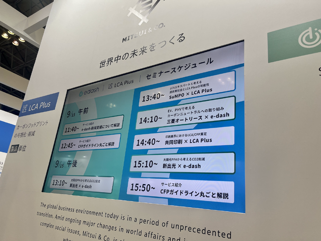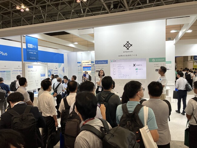 今回のブースは、三井物産株式会社とSuMPOが共同開発している製品単位のCO2排出量算定プラットフォーム「LCA Plus」との共同で出展しました。