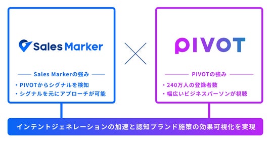 国内初※1「顧客起点」でおこなう新時代の営業手法「インテントセールス」を実現する『Sales Marker(セールスマーカー)』を開発・提供する株式会社Sales Marker(本社:東京都港区、代表取締役 CEO:小笠原 羽恭、以下:当社)は、ビジネス映像メディア『PIVOT』を運営するPIVOT株式会社(本社:東京都渋谷区、代表取締役 CEO:佐々木 紀彦、以下:PIVOT)との協業をお知らせします。