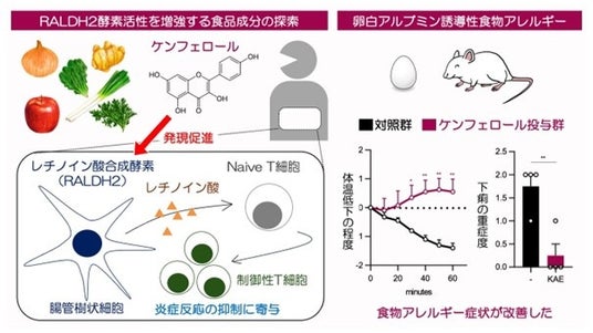 図1. 本研究の概要。ポリフェノールの一種であるケンフェロールの投与により炎症反応が抑制されるメカニズムを明らかにし、モデルマウスを用いた実験から、食物アレルギー症状が緩和することも確認した。
