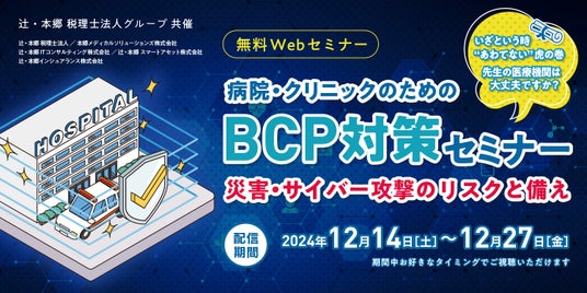 辻・本郷 税理士法人(本社:東京都新宿区、理事長:徳田孝司)は、本郷メディカルソリューションズ株式会社(本社:東京都新宿区、代表取締役社長:須田博行)、辻・本郷 ITコンサルティング株式会社(本社:東京都渋谷区、代表取締役:黒仁田健)、辻・本郷 スマートアセット株式会社(本社:東京都新宿区、代表取締役:吉川僚)、辻・本郷インシュアランス株式会社(本社:東京都新宿区、代表取締役:本郷孔洋)の5社共催で「病院・クリニックのためのBCP対策セミナー 災害・サイバー攻撃のリスクと備え」を開催します。