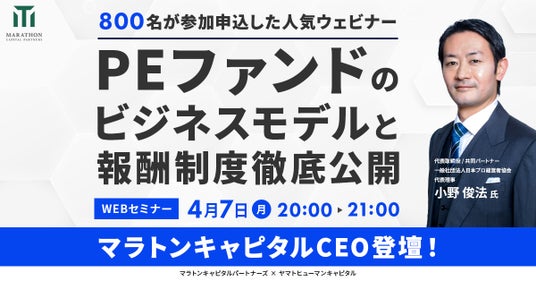 ヤマトヒューマンキャピタル株式会社(本社:東京都千代田区、代表取締役:堀江 大介)は、2025年4月7日(月) 20:00よりオンラインにて、マラトンキャピタルパートナーズ株式会社 代表取締役/共同パートナー/一般社団法人日本プロ経営者協会代表理事の小野 俊法氏にご登壇いただくウェビナー『PEファンドのビジネスモデルと報酬制度徹底公開』を開催いたします。