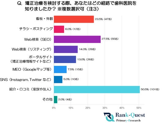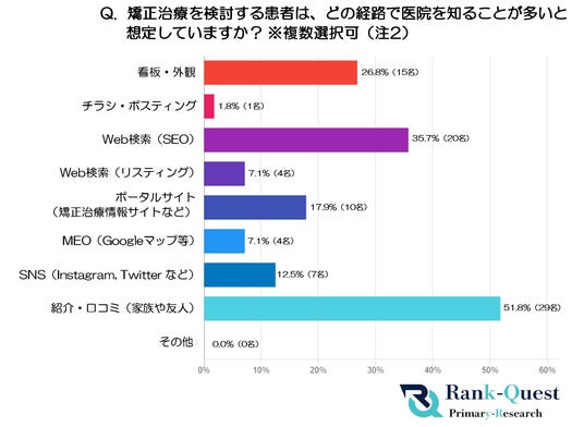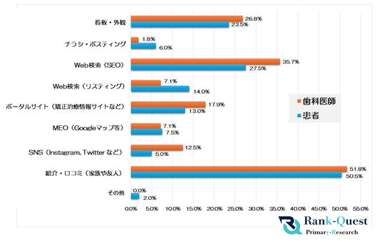 そこで、Google検索【SEO対策】で1位を獲得した実績(注1)を持つランクエスト(https://rank-quest.jp/column/column/how-to-seo/ )は、矯正治療を行う独立開業歯科医師56名と矯正治療の経験がある患者200名を対象に、医院の「認知経路」に関する調査を実施しました。