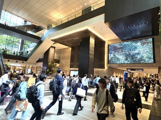 今回、WonderScapeでは「森のプラザ」に隣接する地下連絡通路上部空間に約300インチの大型デジタルサイネージ「大手町タワービジョン」を新設し、運用を開始しました。今後、広場空間「森のプラザ」において「大手町タワービジョン」との連動によるプロモーションイベントを実施することで、空間全体を活用した情報発信を行ってまいります。