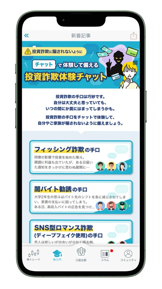 「投資詐欺体験チャット」は株たすアプリ内、また当社ホームページにて無料で公開しておりますので、ぜひご活用ください。