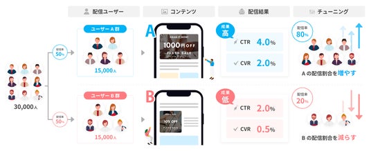 「開封率」や「クリック率」をもとに、最も成果の高い分岐割合を学習し、ABテストの分岐率を自動で最適化します。