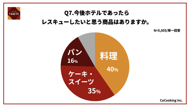 ・ホテルでのレスキューにおいて、最も希望が多かったのは「料理」で40%。次いで「ケーキ・スイーツ」が35%、パンが「16%」という結果となりました。