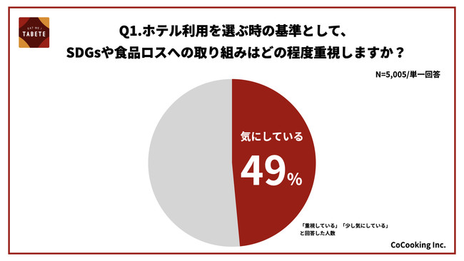 株式会社コークッキング(以下コークッキング)の展開する国内最大級の食品ロス削減のためのフードシェアリングサービス「TABETE(タベテ)」が、登録ユーザー約5,000人に対し、ホテルの食品ロス削減やSDGsへの取り組みが与えるブランドイメージ効果に対するアンケート調査を行いました。その結果、ホテルを選ぶ判断基準として食品ロス削減やSDGsへの取り組みを考慮している割合が48%以上。その内重視する取り組みは、「食品ロス削減」への取り組みが61%となりました。また、食品ロス削減対策としてTABETEを導入した後のホテルへのブランドイメージは、59%が「上がった」と回答し、ホテルにおける食品ロス削減の取り組みが利用者に重視されていることが分かりました。