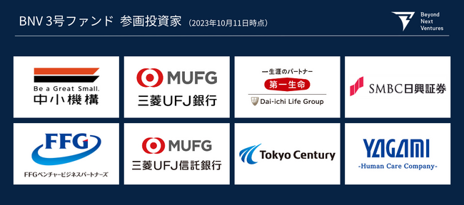 Beyond Next Ventures株式会社(本社:東京都中央区、代表取締役社長:伊藤毅、以下「当社」)は、BNV3号ファンド(正式名称:Beyond Next Ventures3号投資事業有限責任組合)を設立いたしました。1号・2号ファンドの既存投資家である独立行政法人中小企業基盤整備機構、株式会社三菱UFJ銀行、第一生命保険株式会社、東京センチュリー株式会社に加え、新たにSMBC日興証券株式会社、三菱UFJ信託銀行株式会社、株式会社FFGベンチャービジネスパートナーズ、株式会社八神製作所に参画を頂き、最終的なファンド目標額200~250億円に対して、現時点で100億円超の規模で設立を完了致しました。