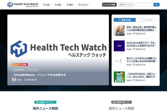 「HealthTechWatch」の前身である「mHealth Watch」は、2013年からスポルツと当社で共同運営してきたヘルステックニュースサイトです。国内外のモバイルを活用した健康・医療サービスのトレンドに関するニュースを発信してきましたが、このたび、サイト名称を「HealthTechWatch」に変更し、リニューアルしました。