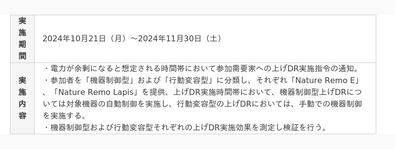 Nature株式会社(所在地:神奈川県横浜市、代表取締役:塩出 晴海、以下「Nature」)は、環境省の委託を受け、関西電力株式会社(所在地:大阪府大阪市、代表取締役社長:森 望、以下「関西電力」)と共同で、昼間の電力需要の創出・消費者の意識行動変容・社会実装の実現を目的とした「需要創出型デマンドレスポンス(上げDR※1)」のモデル実証を2024年10月21日(月)より実施いたします。本実証は、環境省が推進する脱炭素社会実現を目指す新しい国民運動「デコ活」の一環の取り組みです。