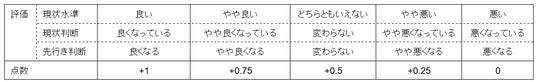 - 調査客体から収集した判断内容を下表のとおり点数化し、その平均値を最低0点から最大100点となる指数(Diffusion Index、DI)として示しています。そのため、この指数では50より大きいほど「購買意欲が強い」、小さいほど「購買意欲が弱い」と判断されていることになります。