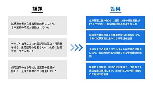 本導入により、廃棄ロスが課題となっていた培地に関して、最大約2,000万円相当の廃棄ロス削減が見込まれるなど、製薬業界ならではの現場課題に対応した先進的な取り組みとなっています。