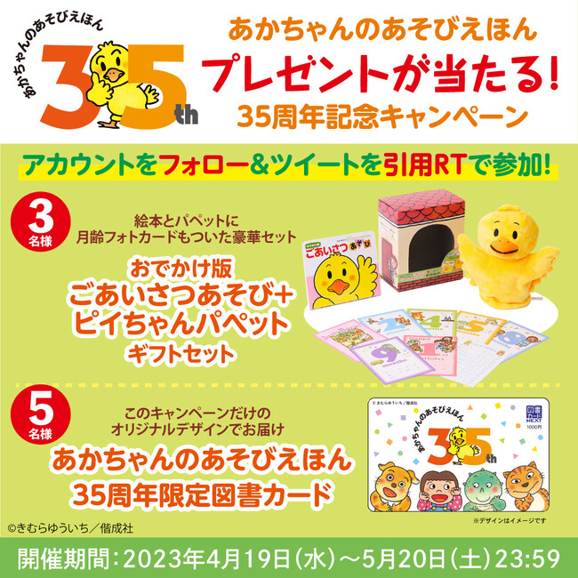 4月19日~、最新刊の発売と合わせて開催! フォロー&引用RTで、3名の方に『おでかけ版 ごあいさつあそび+ピイちゃんパペットギフトセット』、5名の方に「あかちゃんのあそびえほん 35周年限定図書カード」1,000円分が当たります。(開催期間:5月20日まで)