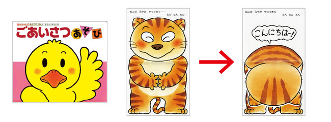 ▲シリーズ第1作『ごあいさつあそび』の中ページ。ねこのミケのおかおを下にめくると、「こんにちはー!」と元気にごあいさつします。