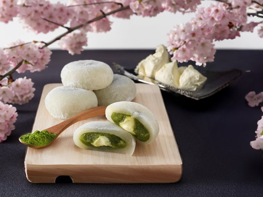 京都の琴引浜の塩を使用したお餅に宇治抹茶餡とマスカルポーネチーズとチェダーチーズ入クリームを包み込みました。もちっとした食感と抹茶のほろ苦さ、そしてクリーミィなチーズの絶妙なあんばいは、まさに和洋折衷。