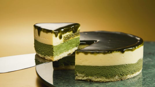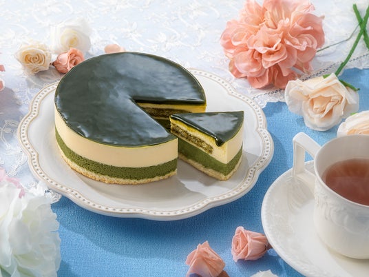 下層は抹茶のベイクドチーズケーキ。上層はレアチーズのムース。表面には抹茶のナパージュをかけ濃い抹茶の苦みを感じるチーズケーキです。