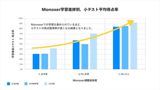 Monoxerの利用状況を3群(A.未学習、B.学習完了率50%未満、C.学習完了率50%以上)に分けてそれぞれの小テストの得点率を分析したところ、A群は30~40%、B群は50~70%と得点に大きなばらつきが見られた一方、C群は全ての科目で80%以上の得点率を記録しました。この結果から、学習完了率が高いほど小テストの得点率も向上する傾向が明らかになり、Monoxerを活用した学習が知識の定着に効果的であることが確認されました。
