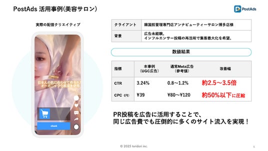 各種インフルエンス・プラットフォーム事業を展開する株式会社トリドリ(本社:東京都渋谷区、代表取締役社長CEO:中山貴之、東証グロース:9337、以下「toridori」)は、インフルエンサーの投稿を活用したSNS広告運用サービス『PostAds(ポストアズ)』の提供を開始したことをお知らせいたします。