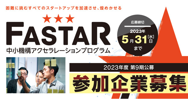 株式会社ツクリエ(本社:東京都千代田区 代表取締役:鈴木英樹 以下、ツクリエ)は、独立行政法人中小企業基盤整備機構(本部:東京都港区 理事長:豊永厚志 以下、中小機構)が主催するアクセラレーションプログラム「FASTAR」の運営事務局として、2023年度 第9期公募を5月1日(月)より開始します。