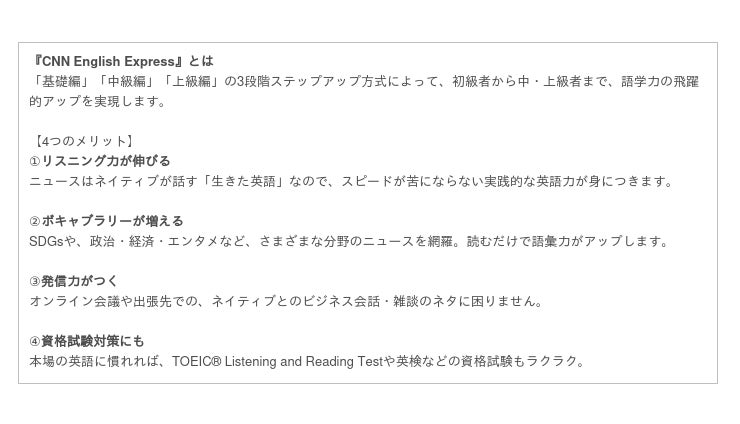 『CNN English Express』(発行:朝日出版社)は、世界をリードするニュースメディアCNNの素材をもとにした、英語力+国際教養力向上を目的とする学習誌です。