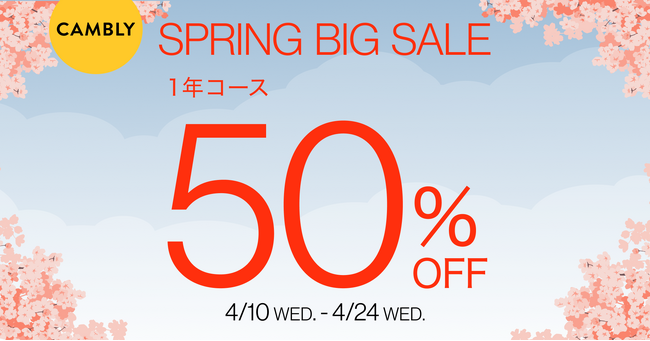 Cambly Inc.(本社:アメリカ・サンフランシスコ、日本代表:佐藤 亜希子)が提供するネイティブ講師とのオンライン英会話サービス「CAMBLY(キャンブリー)」は、本日4月10日(水)より1年コース半額のSPRING BIG SALEをスタートいたします。また今アカウント登録をすると、英語学習に役立つe-bookや動画をまとめた「Training Pack」をもれなくプレゼント!