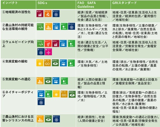 <特定した7つのインパクトとそれらに関連する国際的指標>