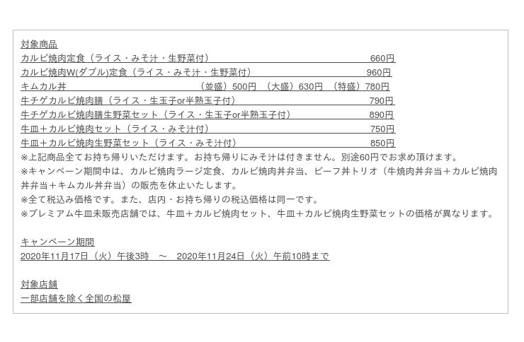 このたび松屋フーズ(本社:東京都武蔵野市、代表取締役社長:瓦葺一利)では、牛めし・カレー・定食・その他丼の「松屋」におきまして、2020年11月17日(火)午後3時より1週間限定で「カルビ増量キャンペーン」を開催いたします。