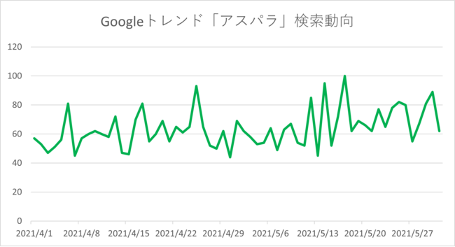 Googleトレンドの「アスパラガス」の検索動向をみると、検索数は4月中旬頃から検索数が伸びはじめ、5月の2週